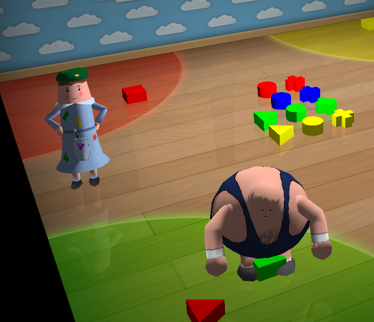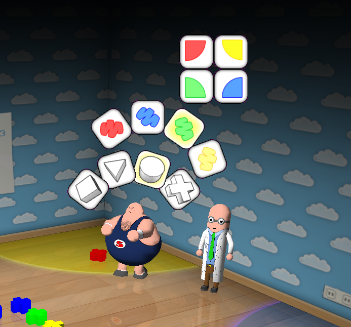The prototype of the virtual environment is composed of three characters that interact with the user. The main user interactions occur when the user clicks on the StrongMan character. When he is clicked on, four buttons appear each representing one shape, a square, triangle, cross, or circle. After the user chooses a shape, colour options nest above the shape option. These colours are red, yellow, blue, and green. These colour and shape combinations correspond to shapes which are in the environment. After the user has chosen a shape and a colour, the user can then choose from one of the four corners, which are also identified by colour, which the user wants to put the shape. The StrongMan then picks up the indicated shape and takes it to the indicated corner. After each shape is moved, the Artist character or the Scientist character comment on the pattern of shapes or colours that the user has created. Additionally, when the user indicates which shape they wish to move, a voice over occurs which says, for example "take the yellow square to the blue corner".